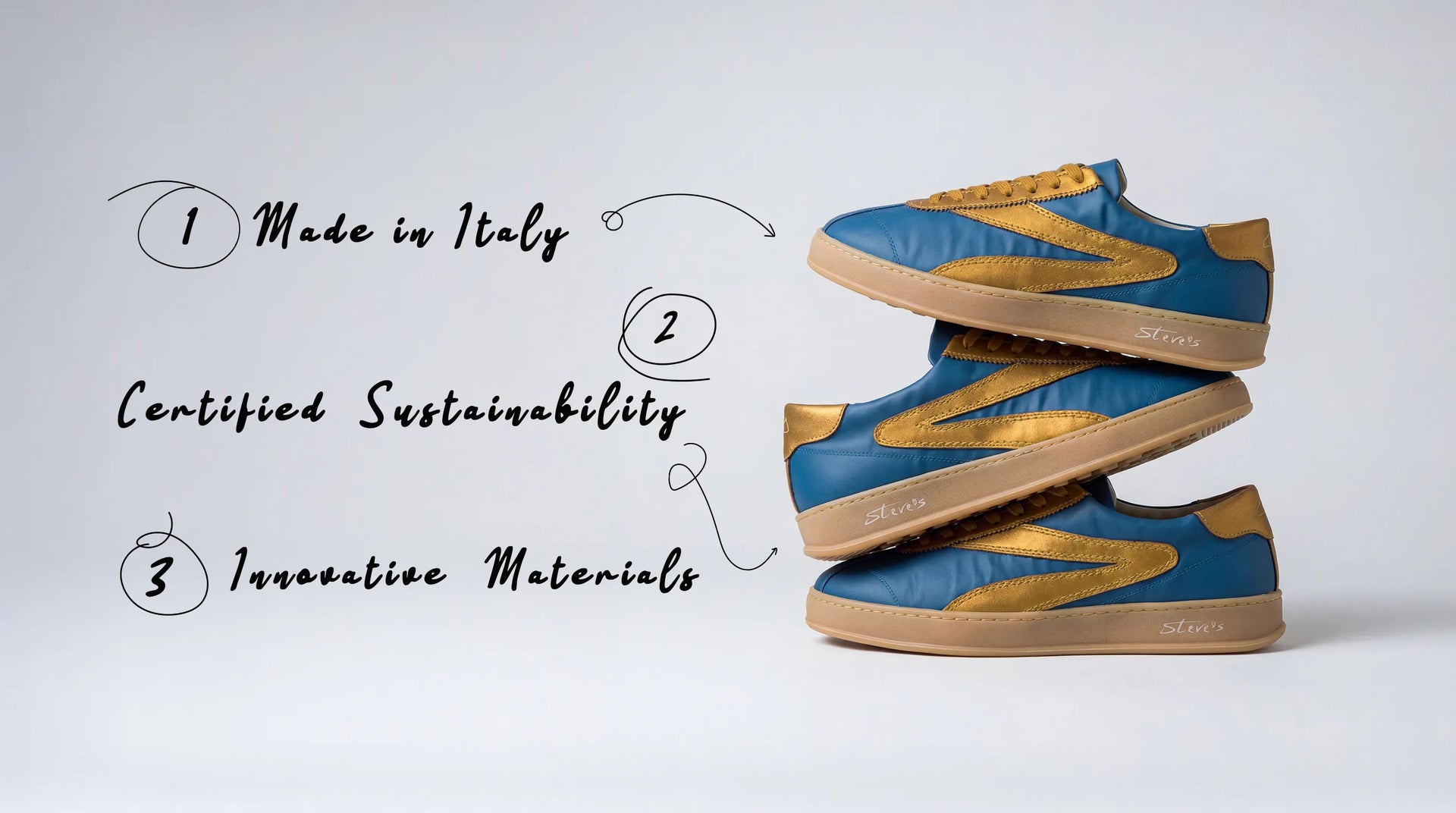 Steve’s nasce nel 2022 da Giulia e Filippo con un’idea semplice: non scegliere più tra stile e sostenibilità. Creiamo sneakers Made in Italy, dove bellezza e innovazione convivono in ogni dettaglio. Indossare Steve’s significa vivere un nuovo concetto di lusso: meno ostentazione, più qualità. Più cura. Più senso.