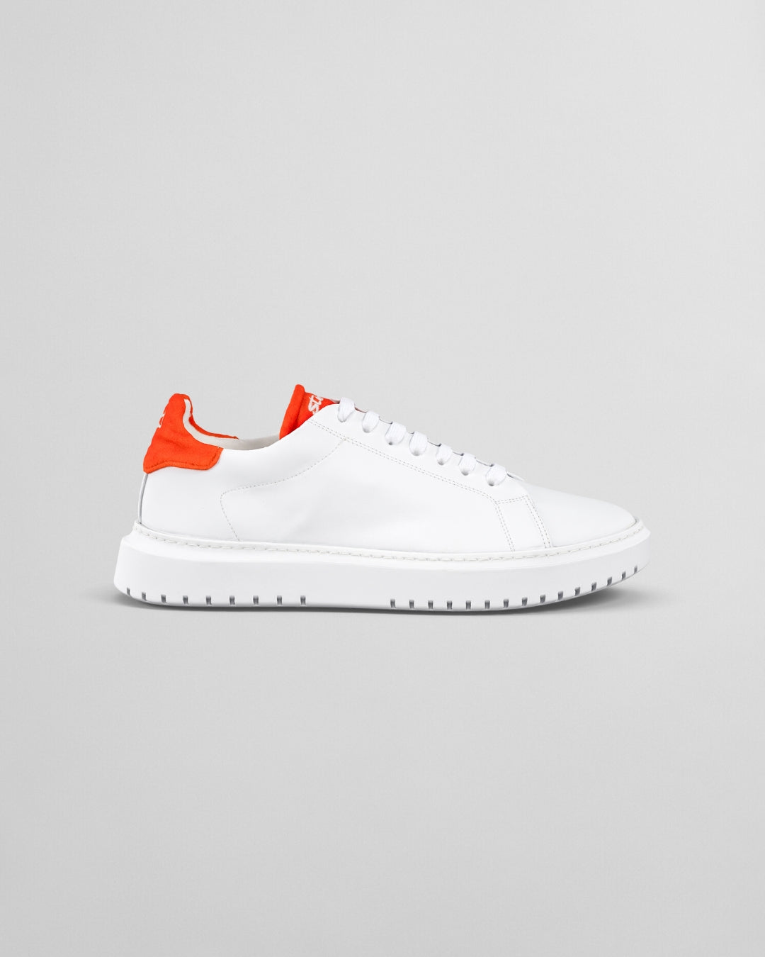 Discover the model Origin Cherry Tomato Of Steve's, the white sneaker with details in orange velvet.