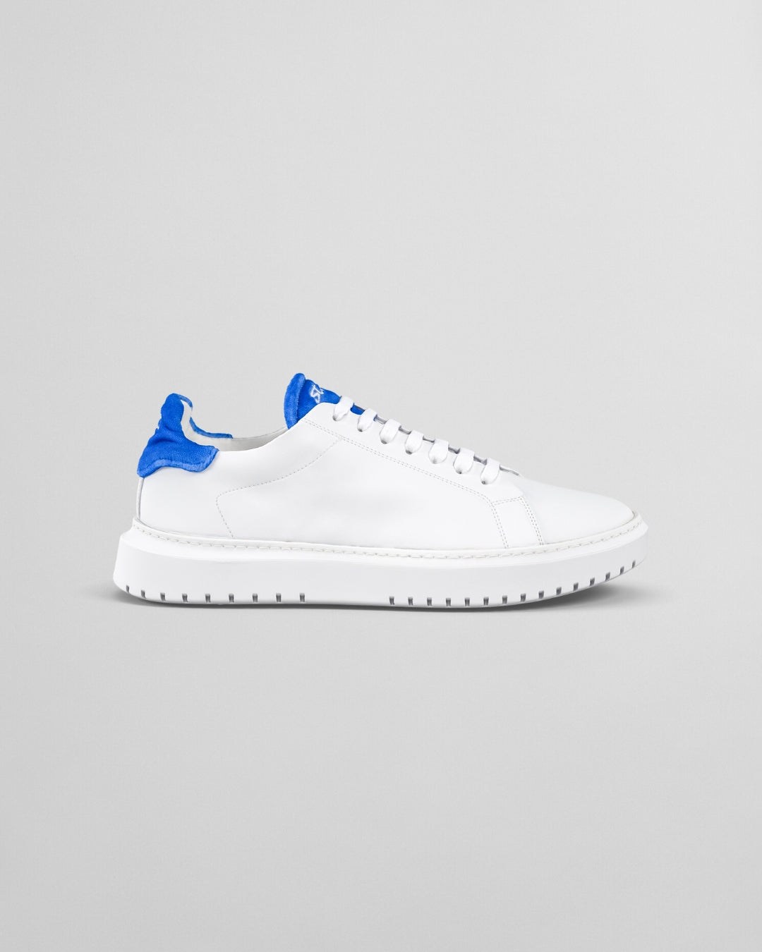 Découvrez le modèle Origin Blu Vanilla de Steve's , la sneaker blanche aux détails en velours bleu électrique .